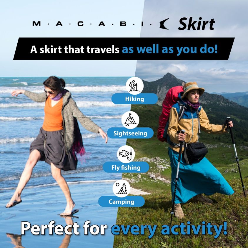 If you’ve spent a lot of time looking for the perfect outdoor skirt, take a look at the Macabi Skirt! The Macabi skirt has proven to be one of the most rugged, versatile and well-traveled garments on the planet. Macabi skirt is much more comfortable and functional than normal skirts or pants, comes with huge pockets to carry everything you don't want to leave in your pack, AND a zippered security pocket for your passport. The Macabi skirt is suitable for all leisure activities such as gardening, camping, hiking, trips to town... everything. The Macabi Skirt adapts to changes by converting from skirts to pants suitable for the weather, your activity or your mood